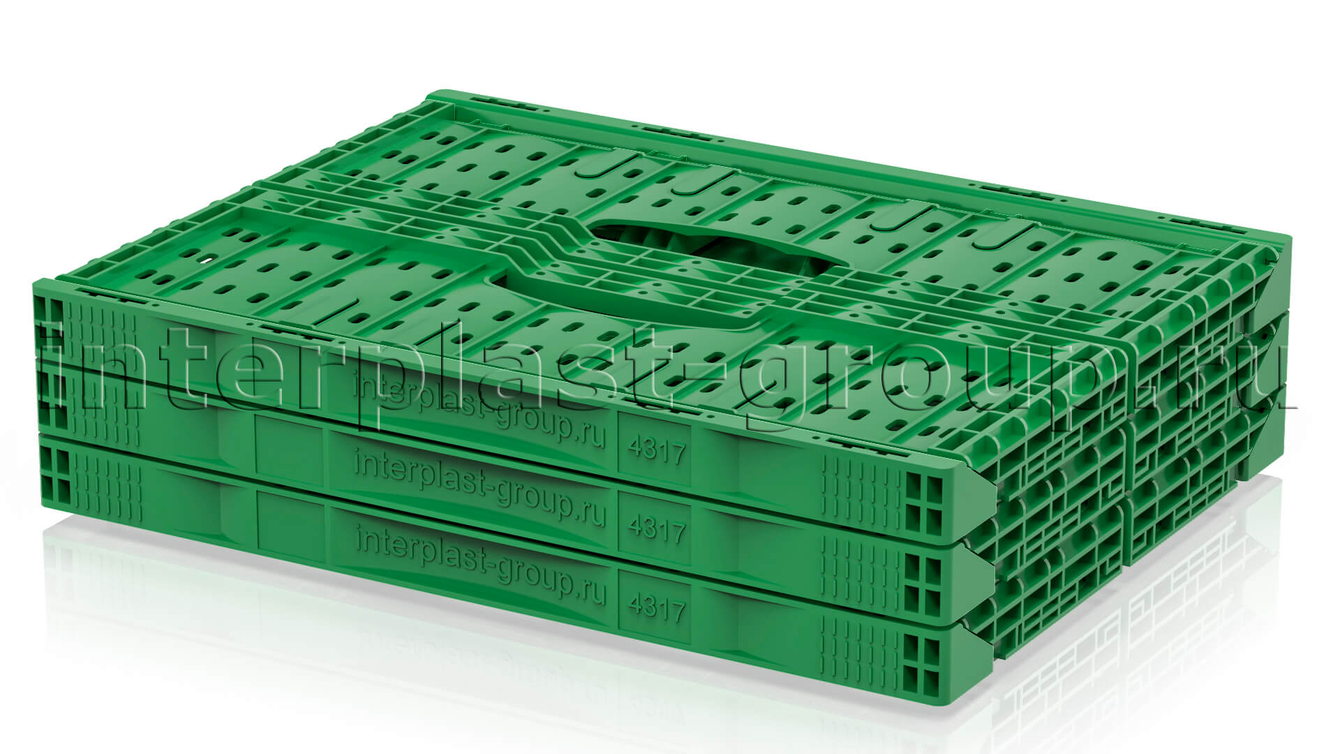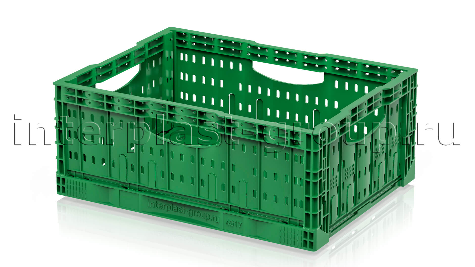 Складные ящики разработаны и спроектированы для хранения и перемещения плодо-овощных культур как внутри производства, так и между торговыми точками и складами. Благодаря функции складывания значительно экономят место при использовании в качестве возвратной тары. Перфорированные стенки обеспечивают сохранение свежести и сочность продуктов перфорации абсолютно на всех стадиях логистики. Штабелируются на паллетах 1200х1000 и 1200х800.