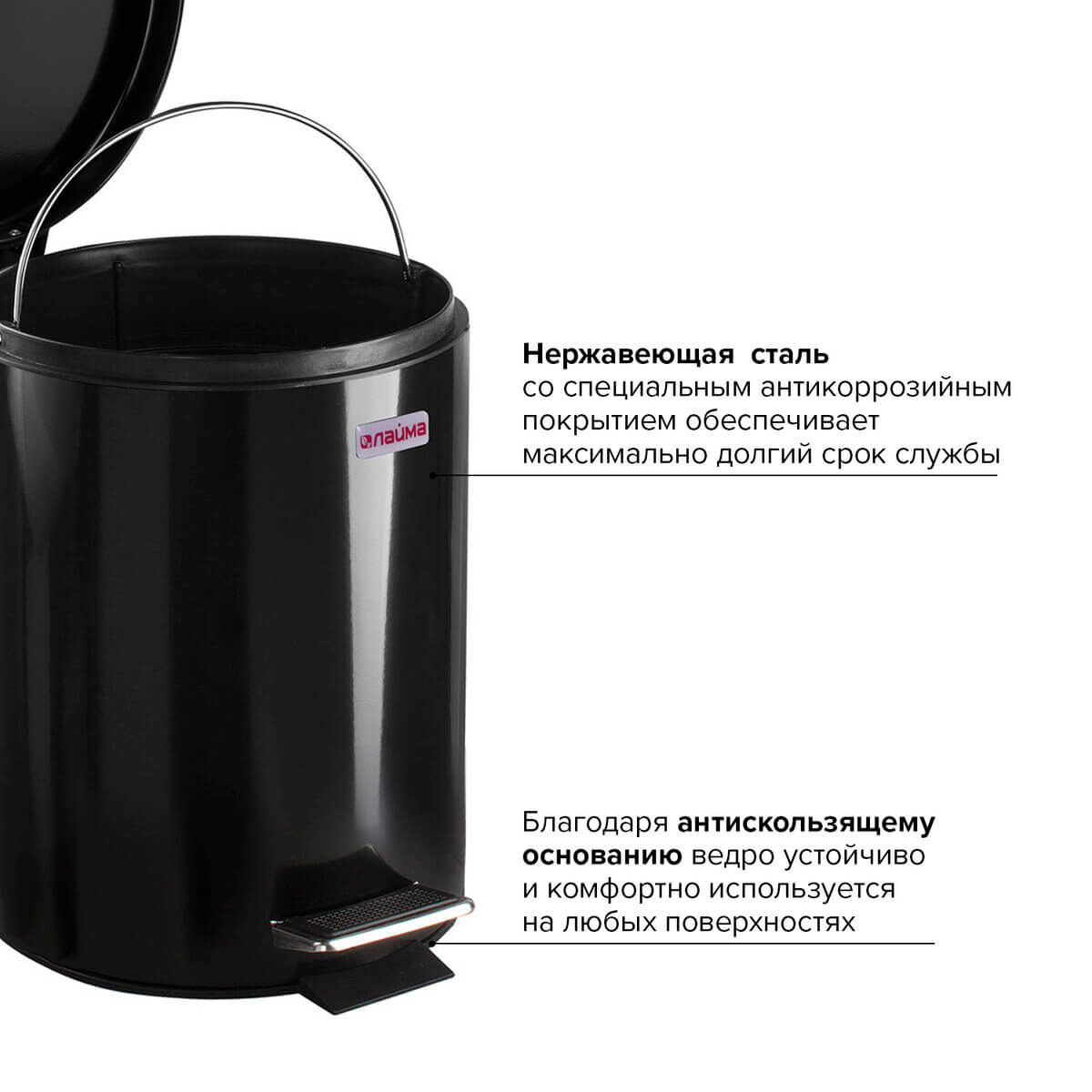 Ведро-контейнер для мусора (урна) с педалью LAIMA Classic, 5 л, черное, глянцевое, металл, со съемным внутренним ведром
